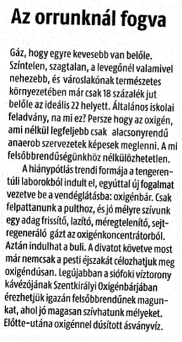 Nem tudom honnan szedték azt az információt, hogy városokban (ráadásul ennyivel) kevesebb a levegő oxigéntartalma. Mit jelenthet az hogy a felsőbbrendűségünkhöz nélkülözhetetlen? (felsőbbrendűek vagyunk?) Az oxigén lazító, méregtelenítő, sejtregeneráló? Poénos, figyelemfelkeltő reklámnak is túlzás (=ordas hazugság) lenne, IMHO.